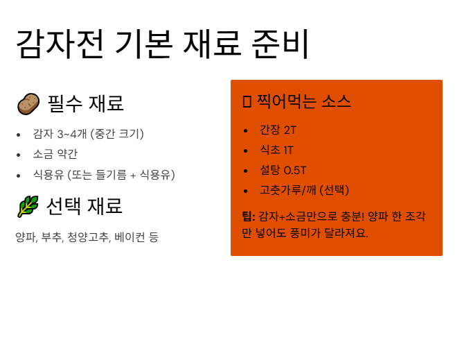 - 응용: 치즈 한 장 올려 녹이거나, 김치 다져 넣어 “김치감자전”으로 변형