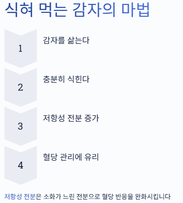 감자를 삶은 뒤 식혀서 먹으면 저항성 전분(소화가 느린 전분)이 늘어 혈당 반응에 유리할 수 있다는 연구들이 있습니다.