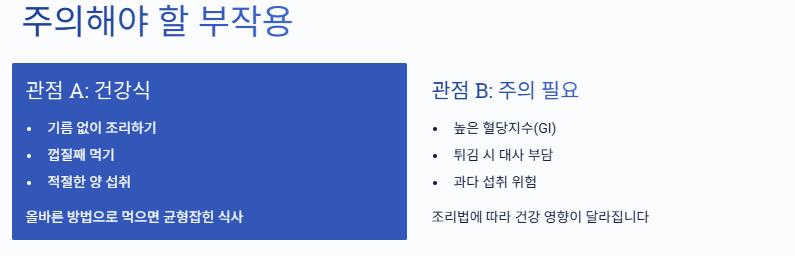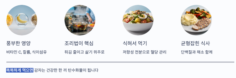 - 양 조절: 감자는 “채소” 느낌이지만 식사에서는 보통 전분(탄수화물) 파트로 취급된다는 점 기억하기
