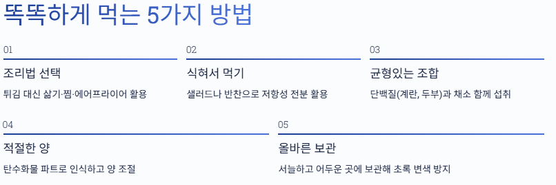 - 단독으로 많이 먹지 말고 단백질(계란/두부/닭가슴살) + 채소와 같이 먹기