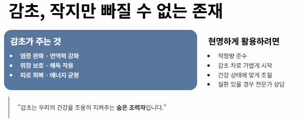 “작지만 빠질 수 없는 존재”, 감초는 우리의 건강을 조용히 지켜주는 숨은 조력자입니다.