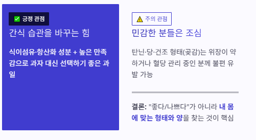 - 긍정 관점: 감은 식이섬유·항산화 성분을 챙기면서도 만족감이 커서, 간식 습관을 바꾸는 데 도움이 된다.