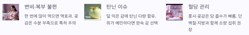 먹고 나서 속 더부룩함, 변비, 위통이 생기면 양을 줄이거나 형태를 바꿔보세요(생감 → 더 익은 감, 곶감 → 반건시 소량 등).