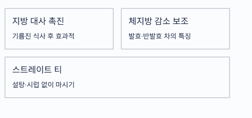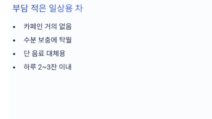 - 보이차·우롱차: 지방 많은 식단과 함께 가볍게 활용