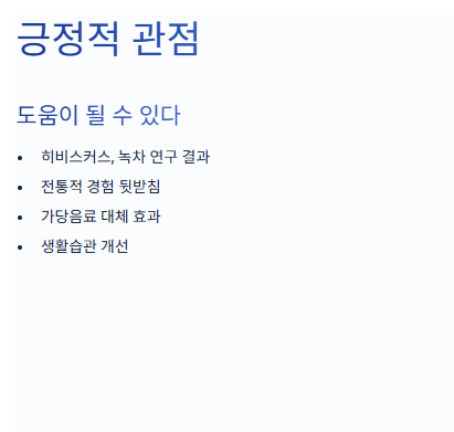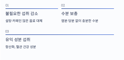 “혈압 관리에 도움이 될 수 있다”는 의견이 존재합니다. - 커피·탄산·가당음료 섭취가 줄어들면서