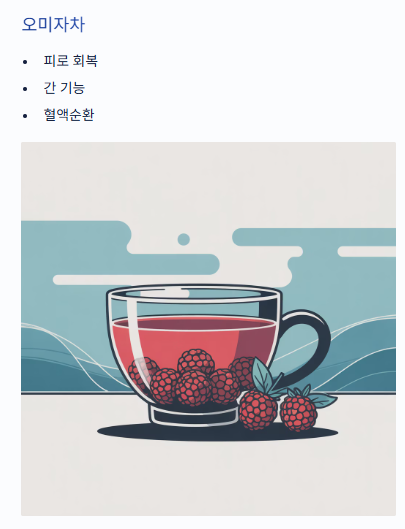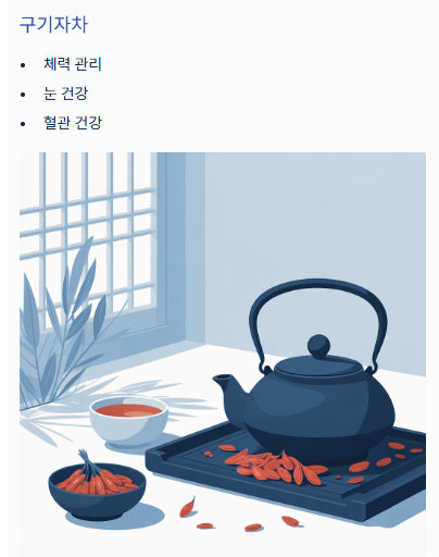 - 구기자차·오미자차: 전통적으로 혈관·피로 관련 차로 사용.