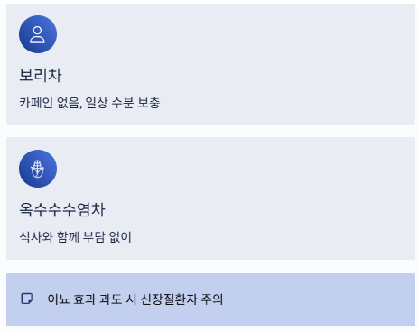 - 예 → 보리차, 옥수수수염차, 무카페인 허브차 위주
