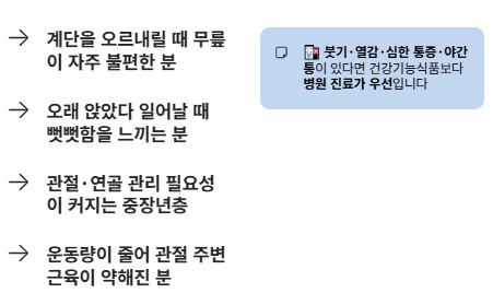 일상적 불편감 관리가 목적이라면 건강기능식품이 도움이 될 수 있지만, 붓기·열감·심한 통증·야간통이 있다면 병원 진료가 우선입니다.