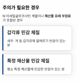 N-아세틸글루코사민 계열이나 해산물 유래 부원료가 함께 들어간 제품은 체질에 따라 주의가 필요합니다.