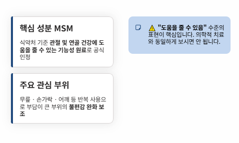 MSM은 식약처 자료에서 관절 및 연골 건강에 도움을 줄 수 있는 기능성 원료로 소개됩니다.