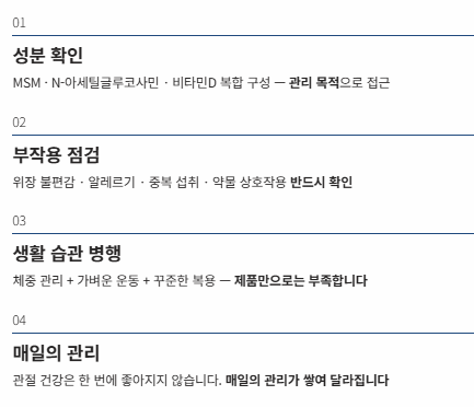 결국 관절 건강은 한 번에 좋아지는 것이 아니라, 매일의 관리가 쌓여 달라지는 영역이라는 점을 기억하는 것이 가장 중요합니다.