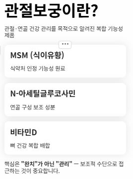 첫째, 관절보궁 같은 제품은 관절 통증 치료제라기보다 보조적 관리 수단으로 보는 시각입니다.