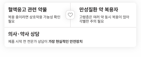 특히 고령층은 여러 약을 함께 복용하는 경우가 많으므로, 제품 시작 전 의사나 약사 상담이 현실적인 안전장치가 됩니다.