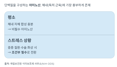 평소에는 몸이 충분히 만들어내서 “필수 아미노산”은 아니지만, 큰 스트레스 상황(중증 질환·수술·화상 등) 에서는 필요량이 늘어 “조건부 필수”로 분류되기도 합니다. (국립보건원 식이보조제 사무소)
