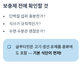 단백질 섭취가 너무 적거나 식사가 불규칙하면, 글루타민보다 전체 단백질·수면·수분이 체감효과가 더 큽니다.
