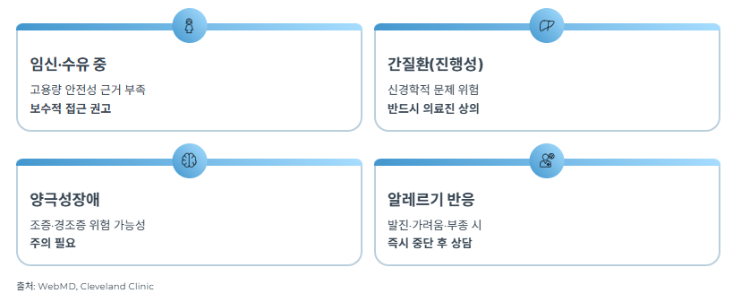 - 양극성장애(조울증): 조증/경조증 위험 가능성을 언급하는 자료가 있어 주의가 필요합니다. (WebMD)