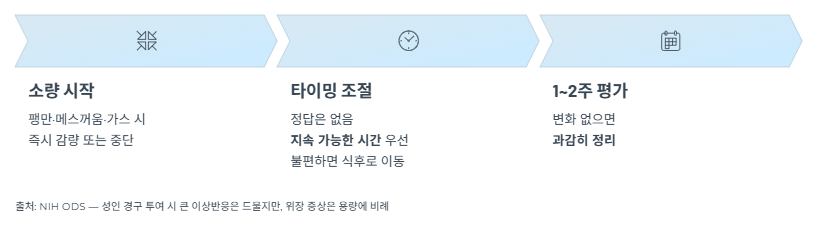 → 처음엔 소량으로 시작하고, 복부팽만/메스꺼움/가스가 생기면 용량을 줄이거나 중단하세요.