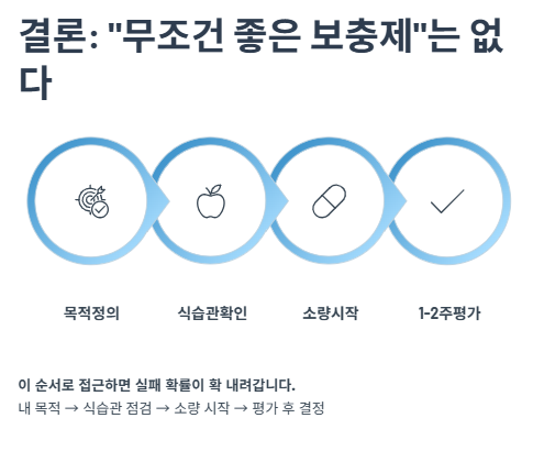 기록해보고 변화가 없다면 “나에게 맞는 보충제인지” 재평가하는 게 합리적입니다.