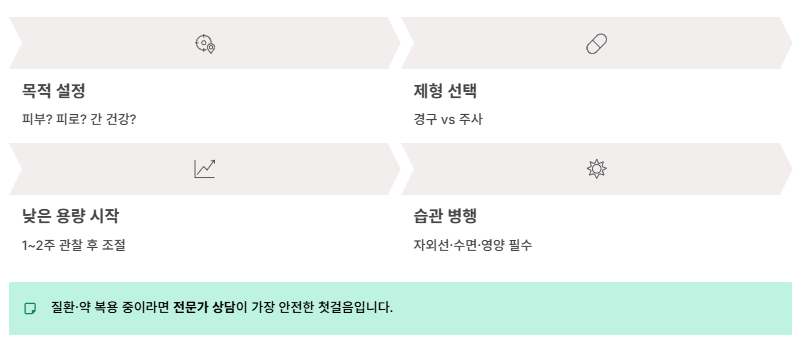 가장 안전한 접근은 목적 설정 → 제형 선택 → 낮은 용량부터 시작 → 습관(자외선/수면/영양) 동반입니다. 내 몸 반응을 기준으로 조절하면서, 질환·약 복용 중이라면 전문가와 상의해 더 안전하게 관리해보세요.