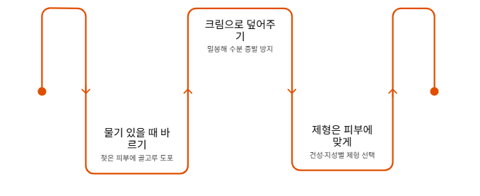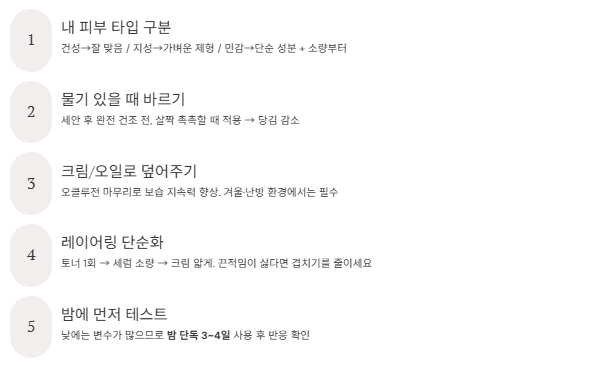 - 토너 1회 → 세럼 소량 → 크림 얇게