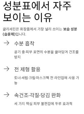 글리세린은 수분을 끌어당겨 피부를 촉촉하게 만드는 대표 보습 성분으로, 속건조·각질 들뜸·당김 완화에 도움이 됩니다.