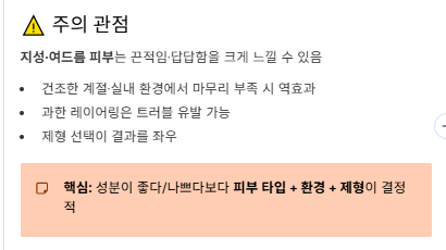 관점 B(주의) : 반대로 지성·여드름 피부는 끈적임과 답답함을 크게 느낄 수 있고, 건조한 계절/실내 환경에서는 마무리 보습이 부족하면 오히려 건조하게 느껴질 수 있다는 의견도 있습니다.