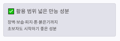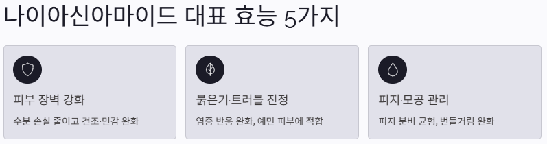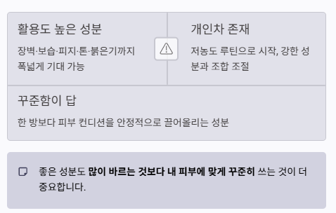 실제로 장벽, 보습, 피지, 톤, 붉은기까지 폭넓게 접근할 수 있어 초보자용 성분으로 평가받는 경우가 많습니다.