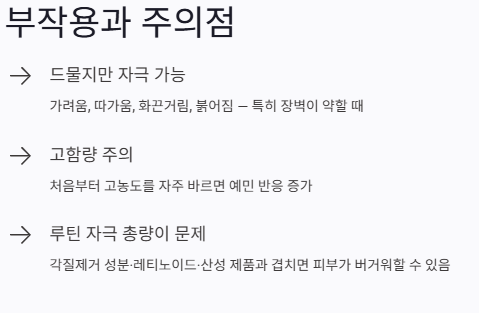 특히 피부 장벽이 이미 약해져 있거나, 고함량 제품을 처음부터 자주 바르면 예민하게 반응할 수 있습니다.