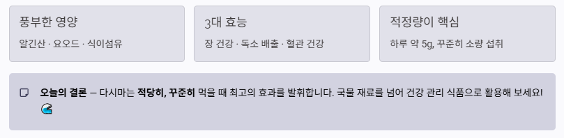 결론적으로 다시마는 ‘적당히 꾸준히’ 먹을 때 가장 큰 효과를 발휘합니다.