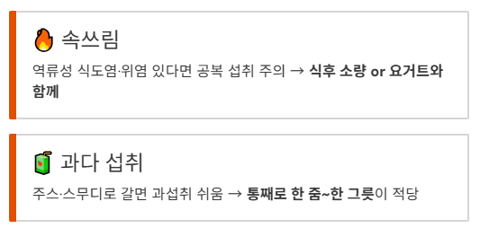 특히 입안이 따갑거나, 가려움/두드러기가 반복되면 섭취를 중단하고 확인이 필요해요.