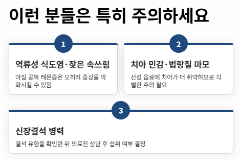 평소 공복에 속이 쓰리거나, 신물이 올라오거나, 역류성 식도염 증상이 있는 사람은 아침 공복 레몬즙 루틴이 오히려 불편함을 키울 수 있습니다.