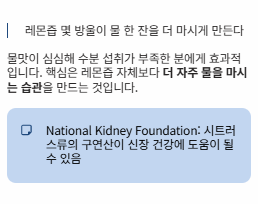 실제로 신장 건강 관련 기관들도 수분 섭취의 중요성을 강조하며, 일부 상황에서는 레몬이나 라임 같은 시트러스류의 구연산이 도움이 될 수 있다고 안내합니다.