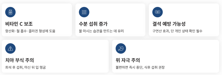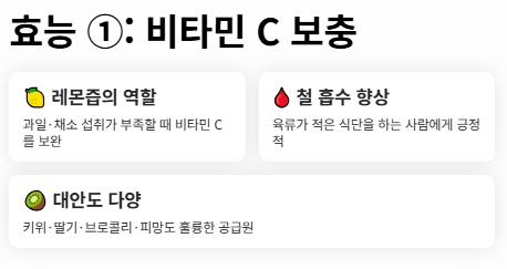 즉 레몬즙은 “특별한 기적의 음료”라기보다, 비타민 C와 수분 섭취를 조금 더 쉽게 도와주는 식재료에 가깝다고 보는 편이 정확합니다.
