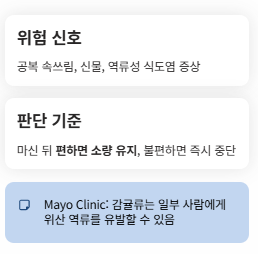 마신 뒤 속이 편하면 소량 유지, 불편하면 중단이 정답입니다.