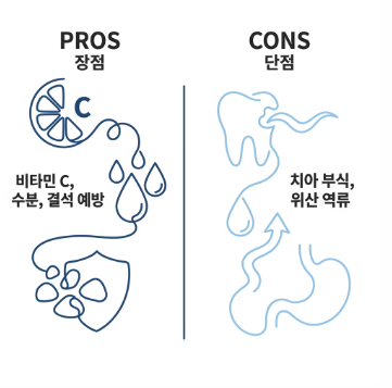 비타민 C와 구연산 덕분에 장점이 분명한 반면, 산도가 높아 치아와 위에 부담을 줄 수도 있기 때문입니다.