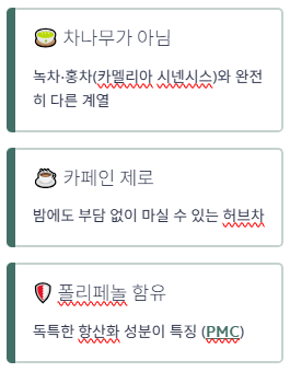 일반 차(녹차·홍차)와 달리 카멜리아 시넨시스(차나무) 계열이 아니라서 카페인이 거의 없고, 특유의 폴리페놀(항산화 성분)을 함유하는 게 특징이에요.