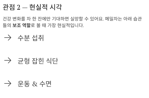 메밀차는 어디까지나 음료이기 때문에, 체중·혈관·피부 같은 큰 변화를 단독으로 만들기보다는