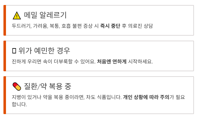 처음부터 큰 컵으로 진하게 마시지 말고, 연하게 1~2잔으로 반응을 보세요. 속이 편한지, 피부나 호흡에 변화가 없는지 체크합니다.