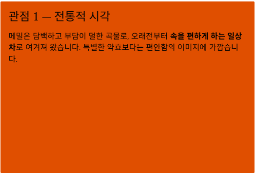 전통적인 식문화 관점에서는 메밀이 담백하고 부담이 덜한 곡물로 여겨져, 차로도 편하게 마셔왔다는 인식이 있습니다.