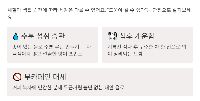 - 효능은 “특별한 치료”보다는 수분 섭취와 식후 개운함, 무카페인 대체 같은 일상 보조 관점이 현실적입니다.