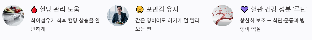 - 메밀 효능: 식이섬유·단백질 기반 포만감, 식후 혈당 완만화 도움 가능, 항산화 성분(루틴) 관심, 장 건강 보조, 밀가루 대체 선택지