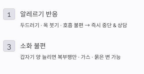 두드러기, 가려움, 입술·목 붓기, 호흡 불편 등이 있었다면 즉시 중단하고 상담이 필요해요.
