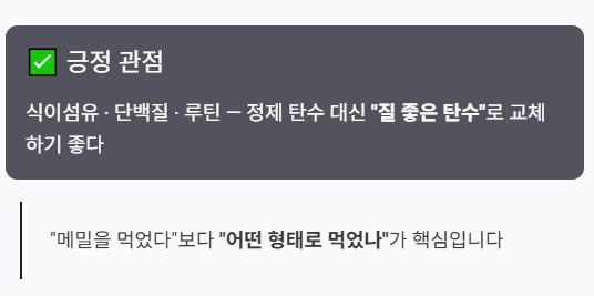 - 긍정 관점: 메밀은 식이섬유·단백질·루틴 등 영양 포인트가 있어, 정제 탄수 위주의 식단에서 “질 좋은 탄수”로 교체하기 좋다.