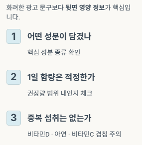 특히 여러 영양제를 함께 먹는 분은 비타민D, 아연, 비타민C가 겹치지 않는지 꼭 체크해야 합니다. 성분이 겹치면 기대보다 부담이 커질 수 있습니다.