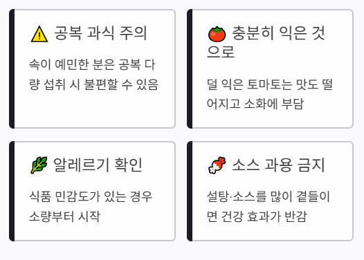 셋째, 토마토 알레르기나 특정 식품에 민감한 분은 소량부터 반응을 살피는 편이 안전합니다.