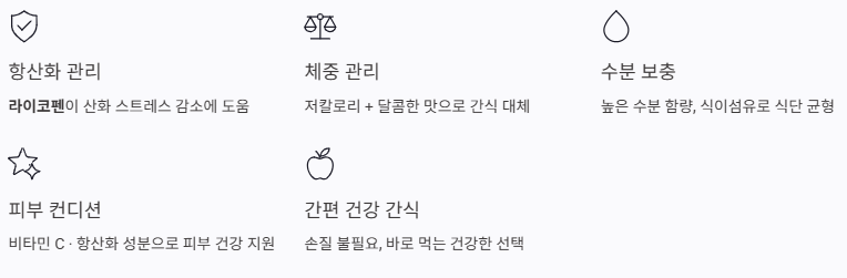 항산화 관리, 가벼운 체중 조절, 수분 보충, 건강 간식 대체 측면에서 장점이 있으며, 생으로 먹어도 좋고 익혀 먹어도 매력이 있습니다.