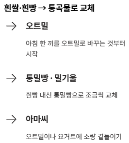 따라서 아침 한 끼를 오트밀로 바꾸거나, 흰빵 대신 통밀빵으로 바꾸는 식으로 천천히 적용하는 것이 좋습니다.