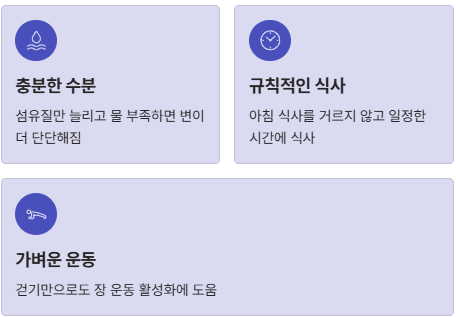 그래서 변비 관리에서는 “섬유질 많은 음식”만 강조할 것이 아니라, 수분 섭취까지 함께 챙겨야 합니다.