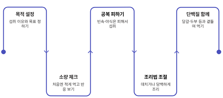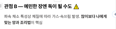 - 해결 방법 : 소량 시작 → 식후 섭취 → 데치기/담백한 양념으로 조절 → 단백질과 함께 구성