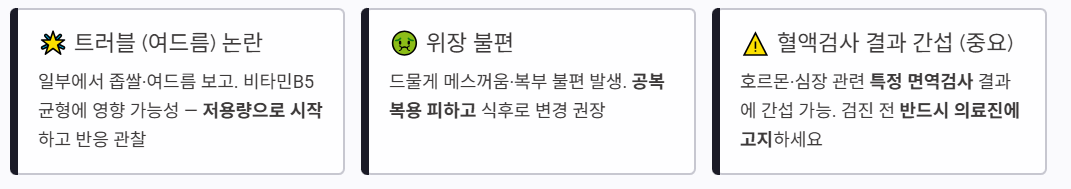 비오틴은 일부 혈액검사(특히 호르몬·심장 관련 특정 면역검사) 결과에 간섭할 수 있다고 알려져 있습니다.